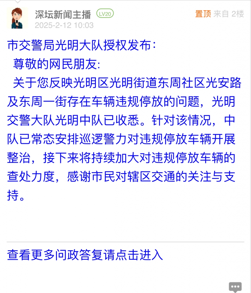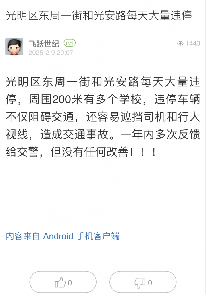 9. 帖文《光明区东周一街和光安路每天大量违停》
