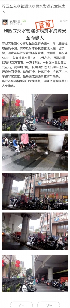 2. 帖文《雅园立交水管漏水浪费水资源安全隐患大》