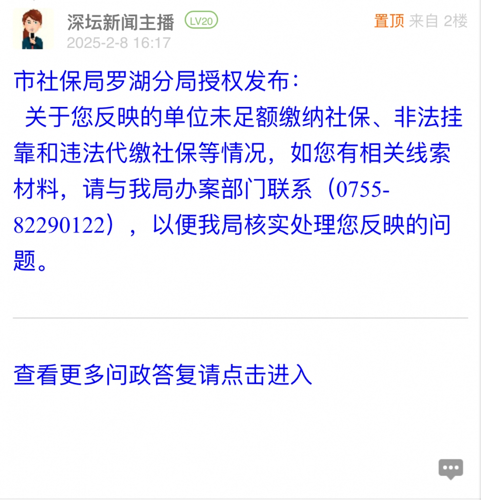 关于您反映的单位未足额缴纳社保、非法挂靠和违法代缴社保等情况,如您有相关线索材料,请与我局办案部门联系(0755-82290122),以便我局核实处理您反映的问题。