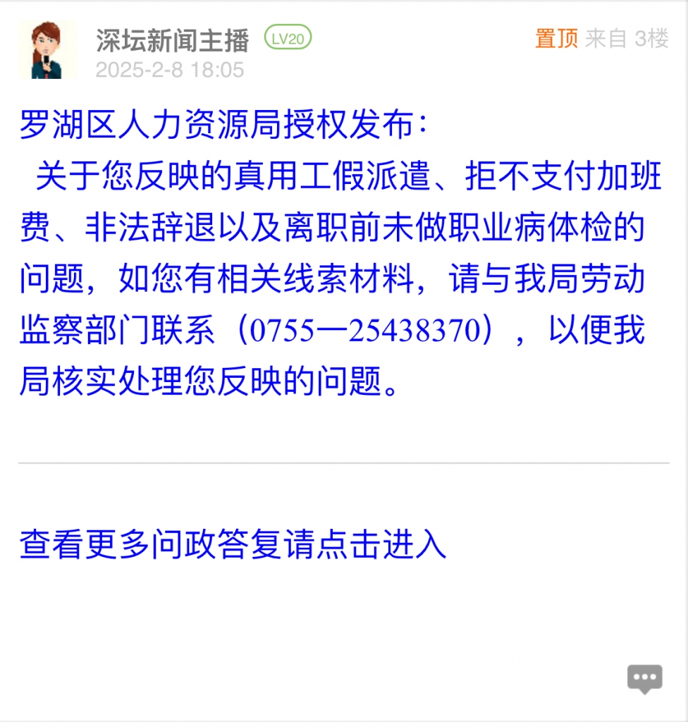 关于您反映的真用工假派遣、拒不支付加班费、非法辞退以及离职前未做职业病体检的问题,如您有相关线索材料,请与我局劳动监察部门联系(0755一25438370),以便我局核实处理您反映的问题。