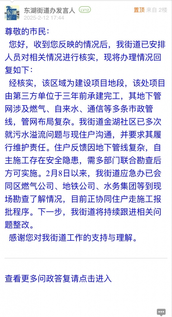 经核实,该区域为建设项目地段,该处项目由第三方单位于三年前承建完工,其地下管网涉及燃气、自来水、通信等多条市政管线,管网布局复杂。我街道金湖社区已多次就污水溢流问题与现住户沟通,并要求其履行维护责任。住户反馈因地下管线复杂,自主施工存在安全隐患,需多部门联合勘查后方可实施。2月8日以来,我街道应急办已会同区燃气公司、地铁公司、水务集团等到现场勘查了解情况,目前正协同住户走施工报批程序。下一步,我街道将持续跟进相关问题整改。