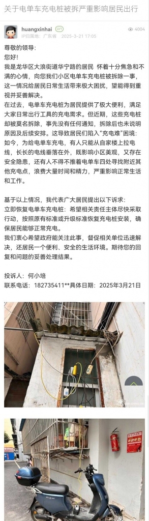 28. 帖文《关于电单车充电桩被拆严重影响居民出行》