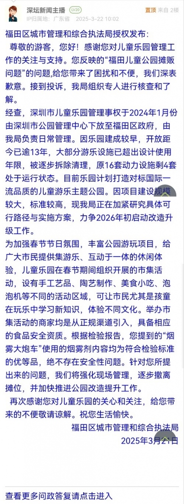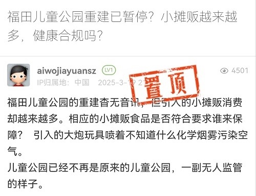 21. 帖文《福田儿童公园重建已暂停?小摊贩越来越多,健康合规吗?》