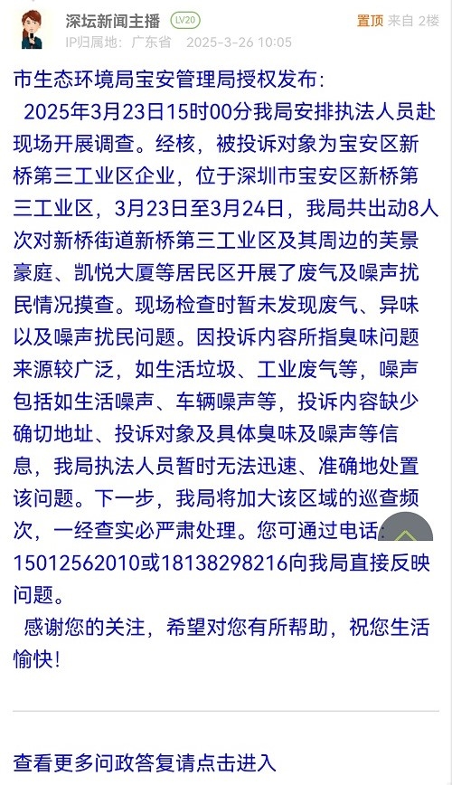 2025年3月23日15时00分我局安排执法人员赴现场开展调查。经核,被投诉对象为宝安区新桥第三工业区企业,位于深圳市宝安区新桥第三工业区,3月23日至3月24日,我局共出动8人次对新桥街道新桥第三工业区及其周边的芙景豪庭、凯悦大厦等居民区开展了废气及噪声扰民情况摸查。现场检查时暂未发现废气、异味以及噪声扰民问题。因投诉内容所指臭味问题来源较广泛,如生活垃圾、工业废气等,噪声包括如生活噪声、车辆噪声等,投诉内容缺少确切地址、投诉对象及具体臭味及噪声等信息,我局执法人员暂时无法迅速、准确地处置该问题。下一步,我局将加大该区域的巡查频次,一经查实必严肃处理。您可通过电话:15012562010或18138298216向我局直接反映问题。感谢您的关注,希望对您有所帮助,祝您生活愉快!