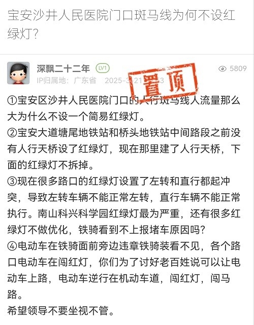 17. 帖文《宝安沙井人民医院门口斑马线为何不设红绿灯?》