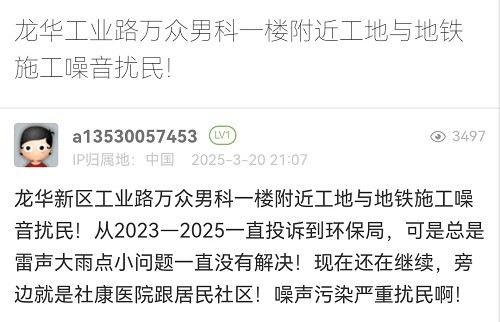 31. 帖文《龙华工业路万众男科一楼附近工地与地铁施工噪音扰民!》