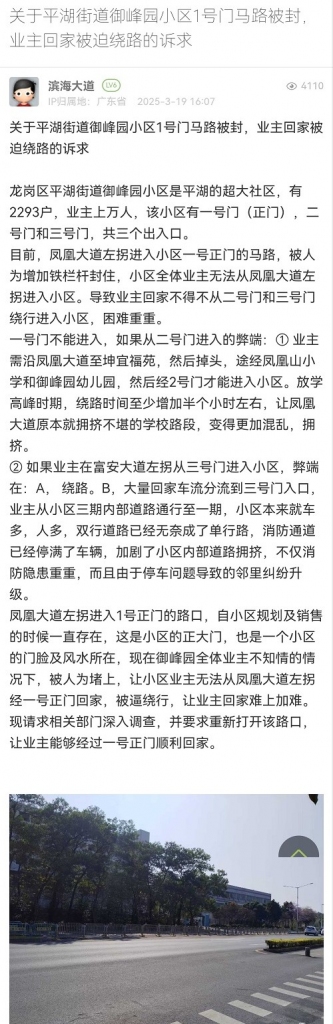 37. 帖文《关于平湖街道御峰园小区1号门马路被封,业主回家被迫绕路的诉求》