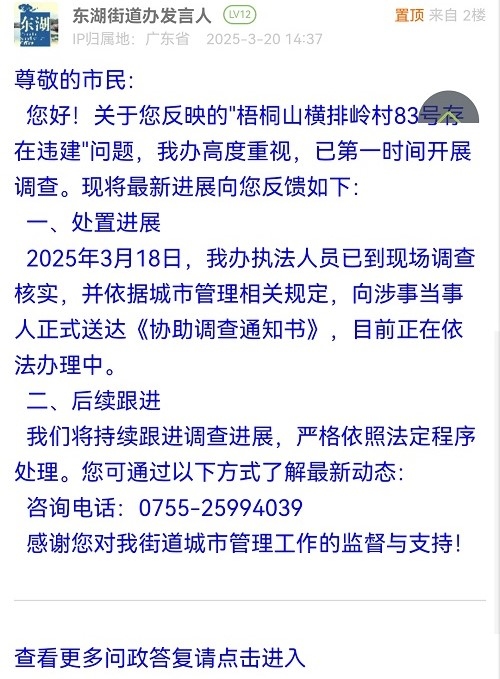 您好!关于您反映的"梧桐山横排岭村83号存在违建"问题,我办高度重视,已第一时间开展调查。现将最新进展向您反馈如下: