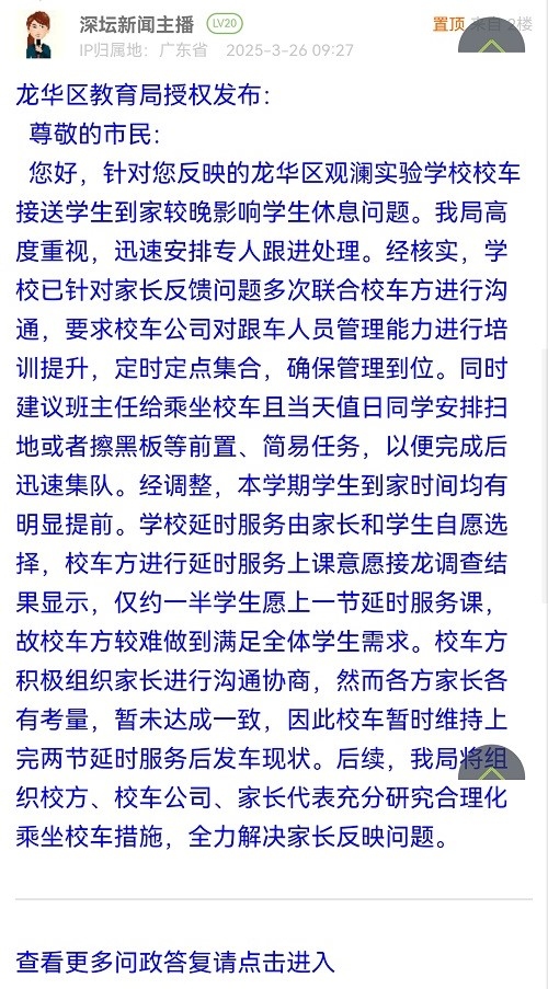 尊敬的市民:您好,针对您反映的龙华区观澜实验学校校车接送学生到家较晚影响学生休息问题。我局高度重视,迅速安排专人跟进处理。经核实,学校已针对家长反馈问题多次联合校车方进行沟通,要求校车公司对跟车人员管理能力进行培训提升,定时定点集合,确保管理到位。同时建议班主任给乘坐校车且当天值日同学安排扫地或者擦黑板等前置、简易任务,以便完成后迅速集队。经调整,本学期学生到家时间均有明显提前。学校延时服务由家长和学生自愿选择,校车方进行延时服务上课意愿接龙调查结果显示,仅约一半学生愿上一节延时服务课,故校车方较难做到满足全体学生需求。校车方积极组织家长进行沟通协商,然而各方家长各有考量,暂未达成一致,因此校车暂时维持上完两节延时服务后发车现状。后续,我局将组织校方、校车公司、家长代表充分研究合理化乘坐校车措施,全力解决家长反映问题。