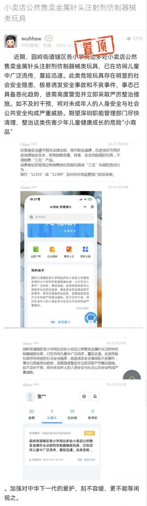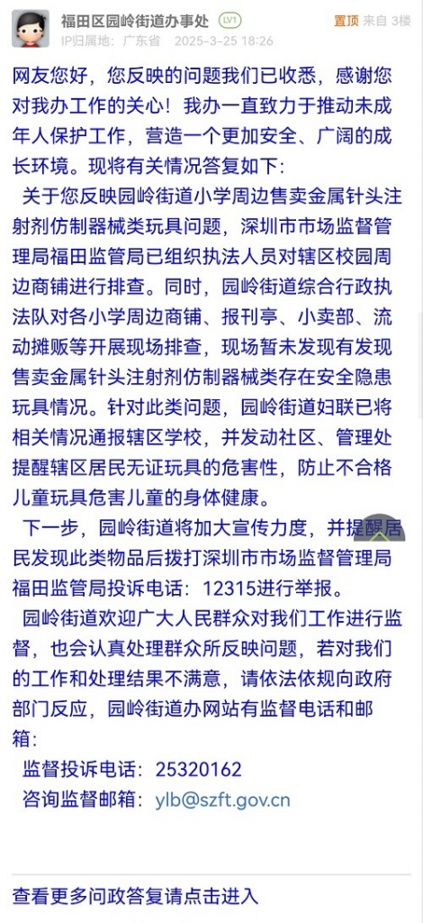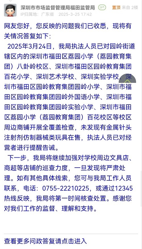 2025年3月24日,我局执法人员已对园岭街道辖区内的深圳市福田区荔园小学(荔园教育集团)八卦岭校区、深圳市福田区园岭教育集团百花小学、深圳艺术学校、深圳实验学校、深圳市福田区园岭教育集团园岭小学、深圳市福田区园岭教育集团园岭外国语小学、深圳市福田区园岭教育集团园岭实验小学、深圳市福田区荔园小学(荔园教育集团)百花校区等校区周边商铺开展全覆盖检查,未发现有金属针头注射剂仿制器械类玩具在售,执法人员已对经营者进行提醒告诫。