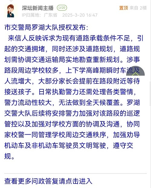 来信人反映诉求为现有道路承载条件不足,引起的交通拥堵,同时还涉及道路规划,道路规划需协调交通运输局实地勘查重新规划。涉事路段周边学校较多,上下学高峰期瞬时车流及人流增大,大部分家长会提前在路段附近等待接送孩子。日常执勤警力还需处理各类警情,警力流动性较大,无法做到全天候覆盖。罗湖交警大队后续将安排警力加强对该路段的巡逻管控以及加强对学校方面的协调及沟通,协同家校警一同管理学校周边交通秩序,加强劝导机动车及非机动车驾驶员文明驾驶,遵守交规。