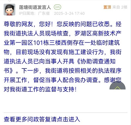 尊敬的网友,您好!您反映的问题已收悉。经我街道执法人员现场核查,罗湖区高新技术产业第一园区101栋三楼西侧存在一处临时建筑物,目前现场没有发现有施工建设行为,我街道执法人员已向当事人开具《协助调查通知书》。下一步,我街道将按照相关的执法程序开展工作,督促当事人配合我办调查。感谢您对我街道工作的监督与支持!