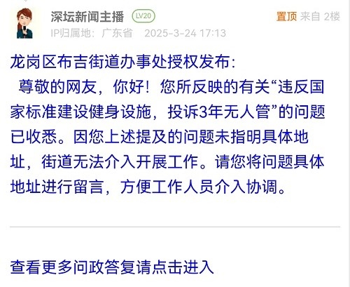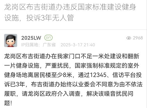 5. 帖文《龙岗区布吉街道办违反国家标准建设健身设施,投诉3年无人管》