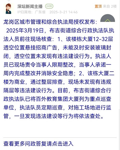 2025年3月19日,布吉街道综合行政执法队执法人员前往现场核查:1、该楼栋大厦12-32层透空位置悬挂招商广告,未能及时安装玻璃封闭,透空位置未发现有违法建设行为。执法人员已现场责令当事人限期整改,当事人承诺一周内完成整改并消除安全隐患;2、该栋大厦二楼为商业,通过整层排查,现场未发现有违规隔层等违法建设行为。目前,布吉街道综合行政执法队已将百外教育集团大厦列为重点巡查单位,执法队员定期巡查,对施工场地进行监管,一旦发现违法建设等行为将依法查处。