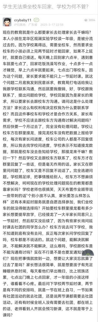 25. 帖文《学生无法乘坐校车回家,学校为何不管?》