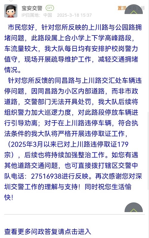 针对您所反馈的同昌路与上川路交汇处车辆违停问题,因同昌路为小区内部道路,而非市政道路,交警部门无法开具处罚,我大队后续将组织警力加大巡逻力度,对此路段停放车辆进行引导劝离;对于在上川路违停车辆,符合执法条件的我大队将严格开展违停取证工作,(2025年3月以来已对上川路违停取证179宗),后续也将持续加强整治工作。如您有遇其他道路交通问题,也可直接拨打辖区交警中队电话:27516938进行反映。再次感谢您对深圳交警工作的理解与支持!同时祝您生活愉快!