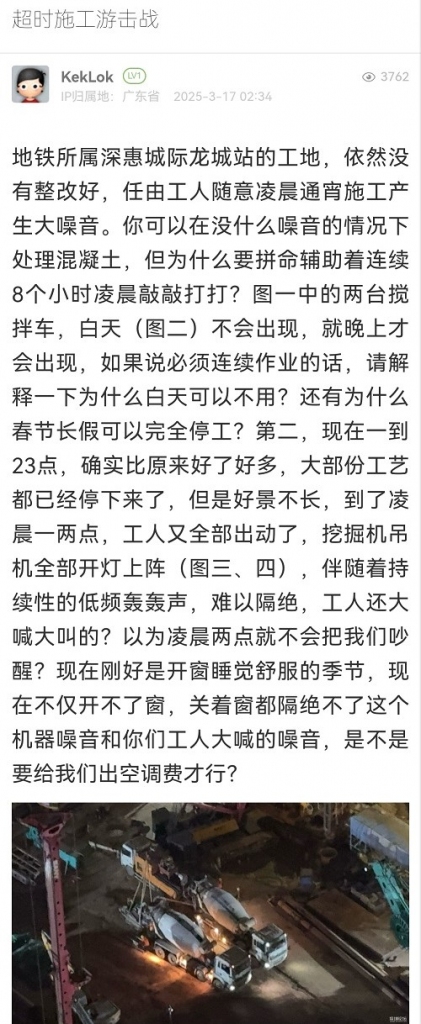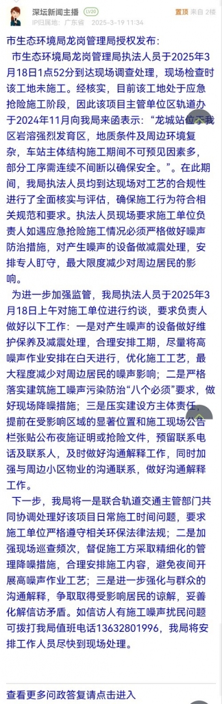 市生态环境局龙岗管理局执法人员于2025年3月18日1点52分到达现场调查处理,现场检查时该工地未施工。经核实,目前该工地处于应急抢险施工阶段,因此该项目主管单位区轨道办于2024年11月向我局来函表示:“龙城站位于我区岩溶强烈发育区,地质条件及周边环境复杂,车站主体结构施工期间不可预见因素多,部分工序需连续不间断以确保安全。”。在此期间,我局执法人员均到达现场对工艺的合规性进行了全面核实与评估,确保施工行为符合相关规范和要求。执法人员现场要求施工单位负责人如遇应急抢险施工情况必须严格做好噪声防治措施,对产生噪声的设备做减震处理,安排专人盯守,最大限度减少对周边居民的影响。