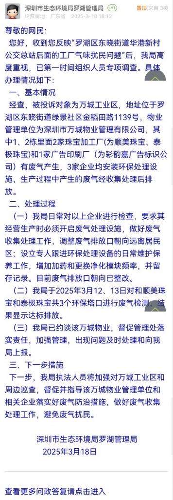您好,收到您反映“罗湖区东晓街道华港新村公交总站后面的工厂气味扰民问题”后,我局高度重视,已第一时间组织人员专项调查。具体办理情况如下: