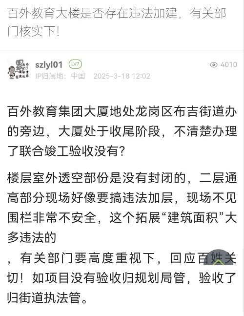 6. 帖文《百外教育大楼是否存在违法加建,有关部门核实下!》