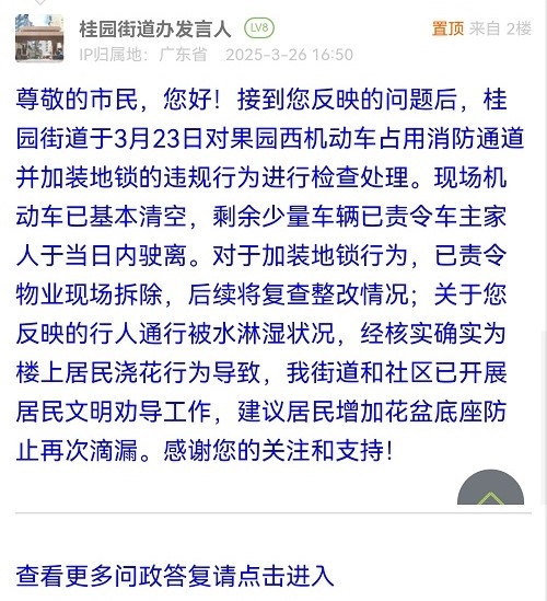 尊敬的市民,您好!接到您反映的问题后,桂园街道于3月23日对果园西机动车占用消防通道并加装地锁的违规行为进行检查处理。现场机动车已基本清空,剩余少量车辆已责令车主家人于当日内驶离。对于加装地锁行为,已责令物业现场拆除,后续将复查整改情况;关于您反映的行人通行被水淋湿状况,经核实确实为楼上居民浇花行为导致,我街道和社区已开展居民文明劝导工作,建议居民增加花盆底座防止再次滴漏。感谢您的关注和支持!