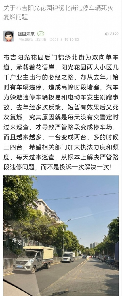 9. 帖文《关于布吉阳光花园锦绣北街违停车辆死灰复燃问题》