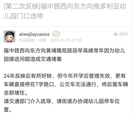 12. 帖文《[第二次反映]福中路西向东方向维多利亚幼儿园门口违停》