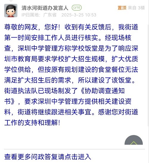 尊敬的网友,您好!收到有关反馈后,我街道第一时间安排工作人员进行核实。经现场核查,深圳中学管理方称学校饭堂是为了响应深圳市教育局要求学校扩大招生规模,扩大优质学位供给,但按原有规划建设的食堂餐位无法满足扩大招生后的需求,所以建设了该饭堂。街道执法队已现场制发了《协助调查通知书》,要求深圳中学管理方提供相关建设资料,街道将继续跟进相关事宜。感谢您对街道工作的支持和理解!