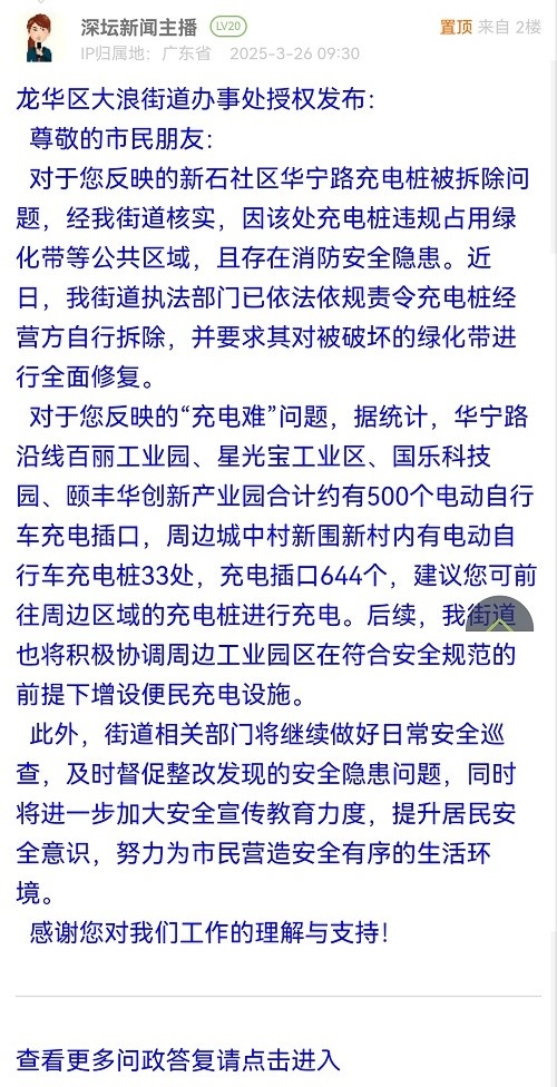尊敬的市民朋友:对于您反映的新石社区华宁路充电桩被拆除问题,经我街道核实,因该处充电桩违规占用绿化带等公共区域,且存在消防安全隐患。近日,我街道执法部门已依法依规责令充电桩经营方自行拆除,并要求其对被破坏的绿化带进行全面修复。对于您反映的“充电难”问题,据统计,华宁路沿线百丽工业园、星光宝工业区、国乐科技园、颐丰华创新产业园合计约有500个电动自行车充电插口,周边城中村新围新村内有电动自行车充电桩33处,充电插口644个,建议您可前往周边区域的充电桩进行充电。后续,我街道也将积极协调周边工业园区在符合安全规范的前提下增设便民充电设施。此外,街道相关部门将继续做好日常安全巡查,及时督促整改发现的安全隐患问题,同时将进一步加大安全宣传教育力度,提升居民安全意识,努力为市民营造安全有序的生活环境。感谢您对我们工作的理解与支持!