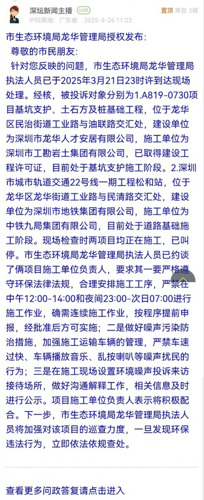 尊敬的市民朋友:针对您反映的问题,市生态环境局龙华管理局执法人员已于2025年3月21日23时许到达现场处理。经核,被投诉对象分别为1.A819-0730项目基坑支护、土石方及桩基础工程,位于龙华区民治街道工业路与油联路交汇处,建设单位为深圳市龙华人才安居有限公司,施工单位为深圳市工勘岩土集团有限公司,已取得建设工程许可证,目前处于基坑支护施工阶段。2.深圳市城市轨道交通22号线一期工程松和站,位于龙华区龙华街道工业路与民清路交汇处,建设单位为深圳市地铁集团有限公司,施工单位为中铁九局集团有限公司,目前处于道路基础施工阶段。现场检查时两项目均正在施工,已叫停。市生态环境局龙华管理局执法人员已约谈了俩项目施工单位负责人,要求其一要严格遵守环保法律法规,合理安排施工工序,严禁在中午12:00-14:00和夜间23:00-次日07:00进行施工作业,确需连续施工作业,按程序提前申报,经批准后方可实施;二是做好噪声污染防治措施,加强施工运输车辆的管理,严禁车速过快、车辆播放音乐、乱按喇叭等噪声扰民的行为;三是在施工现场设置环境噪声投诉来访接待场所,做好沟通解释工作,相关信息及时进行公示。项目施工单位负责人表示将积极配合。下一步,市生态环境局龙华管理局执法人员将加强对该项目的巡查力度,一旦发现环保违法行为,立即依法依规查处。