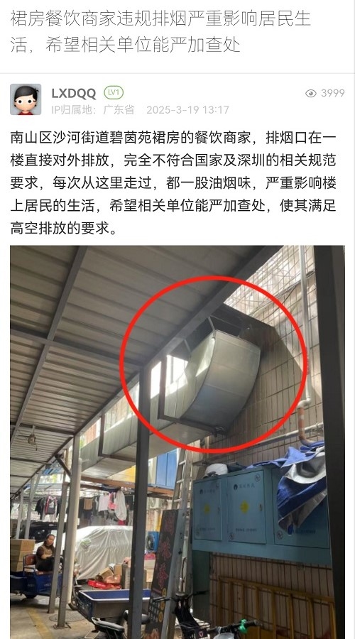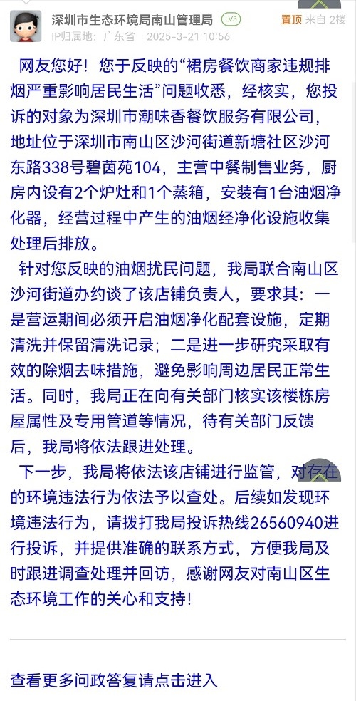 针对您反映的油烟扰民问题,我局联合南山区沙河街道办约谈了该店铺负责人,要求其:一是营运期间必须开启油烟净化配套设施,定期清洗并保留清洗记录;二是进一步研究采取有效的除烟去味措施,避免影响周边居民正常生活。同时,我局正在向有关部门核实该楼栋房屋属性及专用管道等情况,待有关部门反馈后,我局将依法跟进处理。