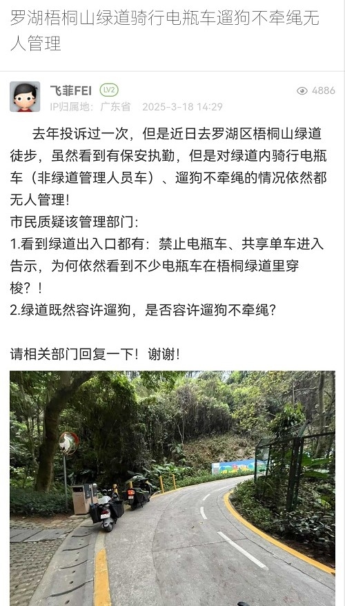 34. 帖文《罗湖梧桐山绿道骑行电瓶车遛狗不牵绳无人管理》