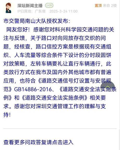网友您好!感谢您对科兴科学园交通问题的关注与反馈,关于路口对向同放存在交织的问题,经核查,路口信控方案是根据现有交通组织、人车流量等综合条件下设计的分时段圆饼对放策略,左转车辆要礼让直行车辆通行,此类放行方式在我市及国内外其他城市都有普遍应用,也符合《道路交通信号灯设置与安装规范》GB14886-2016、《道路交通安全法实施条例》和《道路交通安全法实施条例》相关要求。感谢您对深圳交通管理工作的理解与支持!