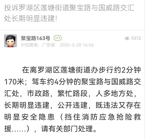 15. 帖文《投诉罗湖区莲塘街道聚宝路与国威路交汇处长期明显违建!》