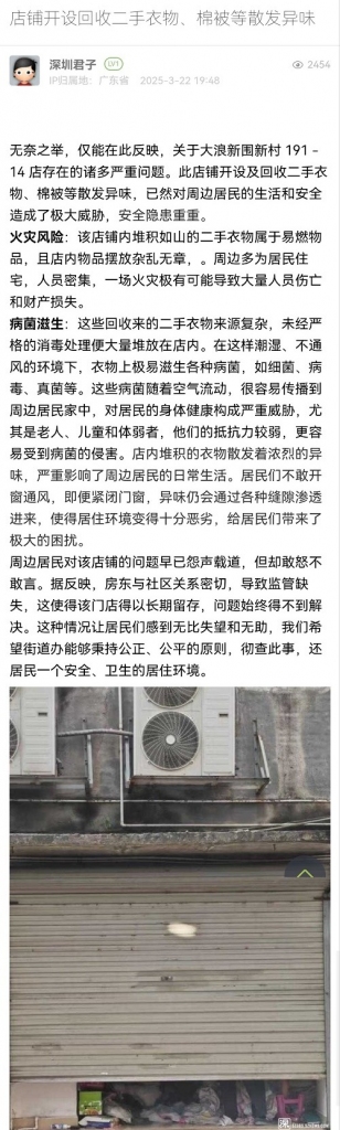 29. 帖文《店铺开设回收二手衣物、棉被等散发异味》