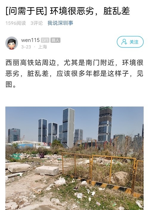 尊敬的市民朋友,您好!首先感谢市民对南山区环境卫生管理工作的关注和监督,针对您反映的问题,我局高度重视,认真核实处理,具体情况回复如下:经核查,市民反映的地块为西丽高铁项目征收地块,前期西丽街道统一开展西丽高铁项目土地整备工作,目前正推进征收,周边商家和业主正逐步搬离,相应地块已逐一移交至西丽高铁项目进行管理,待项目开工将统一进行清理。此外,我局已督促西丽街道联合社区针对西丽高铁项目及周边地块进行全范围严格巡查和监管,避免违法倾倒垃圾、倾倒渣土等行为发生。后续,保洁公司将对该区域进行不定期的常态化巡查,避免此类事件再次发生。感谢市民的理解和支持,给市民带来的不便,我们深表歉意。我们将牢固树立以人民为中心的思想,竭诚做好城市管理和为民服务工作,努力为市民创造良好的城市环境。