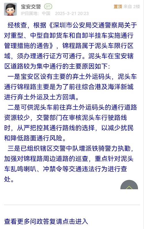 经核查,根据《深圳市公安局交通警察局关于对重型、中型自卸货车和自卸半挂车实施通行管理措施的通告》,锦程路属于泥头车限行区域,须办理通行证方可通行。泥头车在宝安辖区道路较为集中通行的主要原因如下: