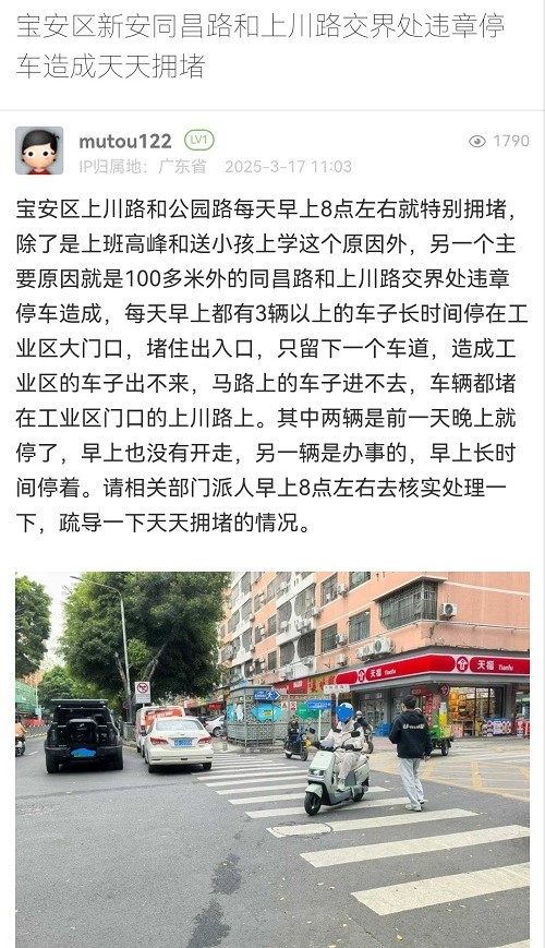 2. 帖文《宝安区新安同昌路和上川路交界处违章停车造成天天拥堵》