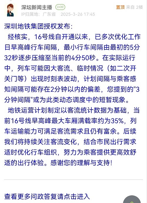 经核实,16号线自开通以来,已多次优化工作日早高峰行车间隔,最小行车间隔由最初的5分32秒逐步压缩至当前的4分50秒。在实际运行中,列车可能因大客流、临时情况(如二次开关门等)出现时刻表波动,计划间隔与乘客感知间隔可能存在2分钟以内的偏差,您提到的"3分钟间隔"或为此类动态调度中的短暂现象。地铁运营计划制定以客流统计数据为基础,当前16号线早高峰最大车厢满载率约为35%,列车运输能力可满足客流需求且仍有富余。后续我们将持续关注客流变化,结合市民出行需求适时优化行车组织,努力为乘客提供更高效舒适的出行体验。感谢您的理解与支持!