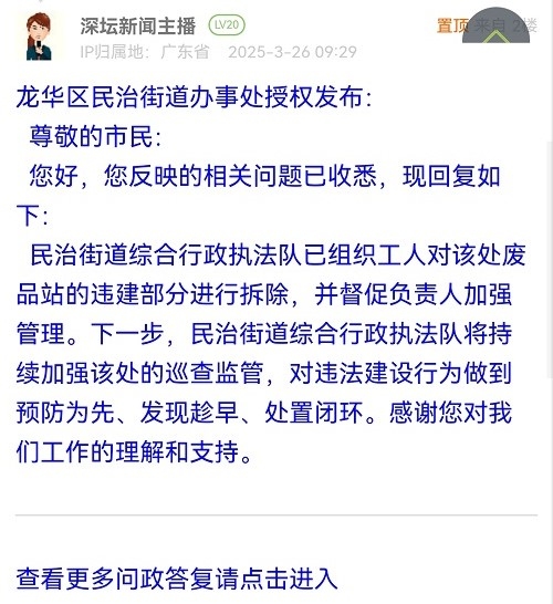 尊敬的市民:您好,您反映的相关问题已收悉,现回复如下:民治街道综合行政执法队已组织工人对该处废品站的违建部分进行拆除,并督促负责人加强管理。下一步,民治街道综合行政执法队将持续加强该处的巡查监管,对违法建设行为做到预防为先、发现趁早、处置闭环。感谢您对我们工作的理解和支持。