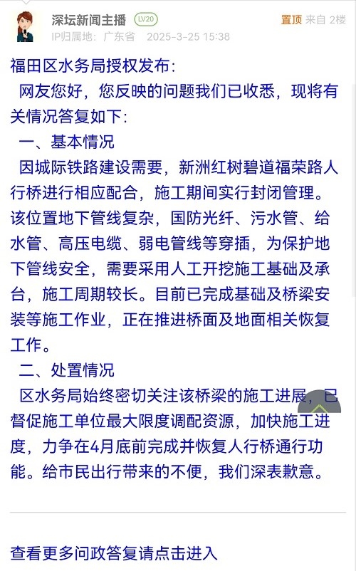 区水务局始终密切关注该桥梁的施工进展,已督促施工单位最大限度调配资源,加快施工进度,力争在4月底前完成并恢复人行桥通行功能。给市民出行带来的不便,我们深表歉意。
