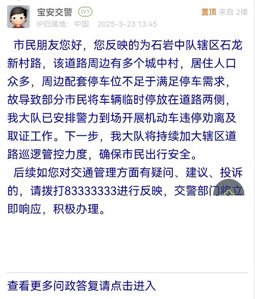 市民朋友您好,您反映的为石岩中队辖区石龙新村路,该道路周边有多个城中村,居住人口众多,周边配套停车位不足于满足停车需求,故导致部分市民将车辆临时停放在道路两侧,我大队已安排警力到场开展机动车违停劝离及取证工作。下一步,我大队将持续加大辖区道路巡逻管控力度,确保市民出行安全。