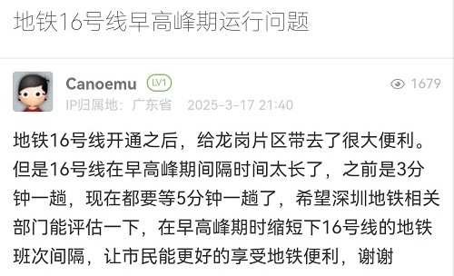 36. 帖文《地铁16号线早高峰期运行问题》