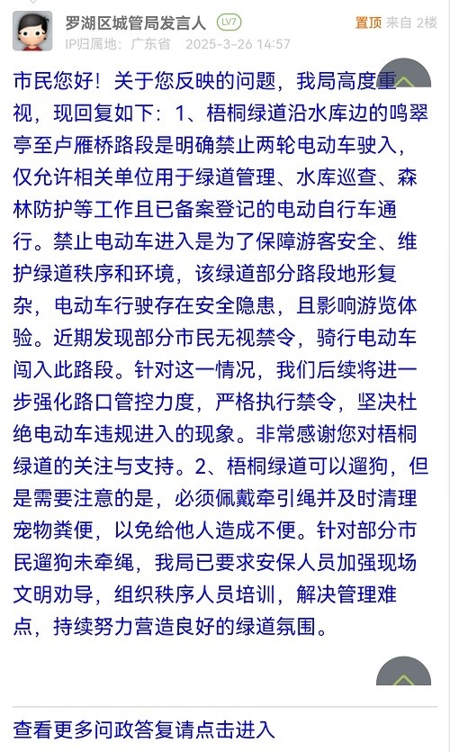 市民您好!关于您反映的问题,我局高度重视,现回复如下:1、梧桐绿道沿水库边的鸣翠亭至卢雁桥路段是明确禁止两轮电动车驶入,仅允许相关单位用于绿道管理、水库巡查、森林防护等工作且已备案登记的电动自行车通行。禁止电动车进入是为了保障游客安全、维护绿道秩序和环境,该绿道部分路段地形复杂,电动车行驶存在安全隐患,且影响游览体验。近期发现部分市民无视禁令,骑行电动车闯入此路段。针对这一情况,我们后续将进一步强化路口管控力度,严格执行禁令,坚决杜绝电动车违规进入的现象。非常感谢您对梧桐绿道的关注与支持。2、梧桐绿道可以遛狗,但是需要注意的是,必须佩戴牵引绳并及时清理宠物粪便,以免给他人造成不便。针对部分市民遛狗未牵绳,我局已要求安保人员加强现场文明劝导,组织秩序人员培训,解决管理难点,持续努力营造良好的绿道氛围。