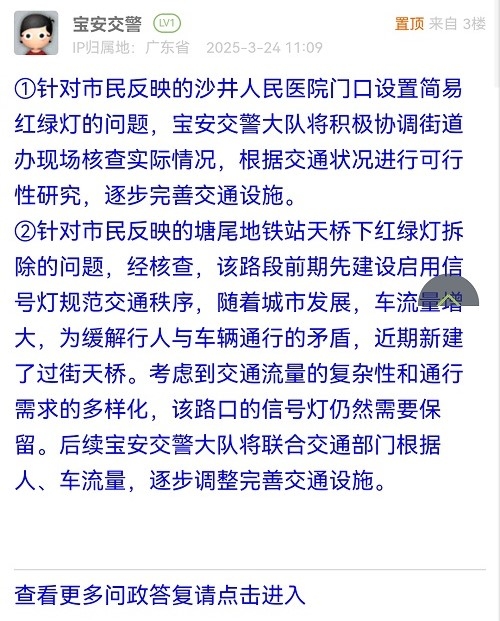 ①针对市民反映的沙井人民医院门口设置简易红绿灯的问题,宝安交警大队将积极协调街道办现场核查实际情况,根据交通状况进行可行性研究,逐步完善交通设施。②针对市民反映的塘尾地铁站天桥下红绿灯拆除的问题,经核查,该路段前期先建设启用信号灯规范交通秩序,随着城市发展,车流量增大,为缓解行人与车辆通行的矛盾,近期新建了过街天桥。考虑到交通流量的复杂性和通行需求的多样化,该路口的信号灯仍然需要保留。后续宝安交警大队将联合交通部门根据人、车流量,逐步调整完善交通设施。