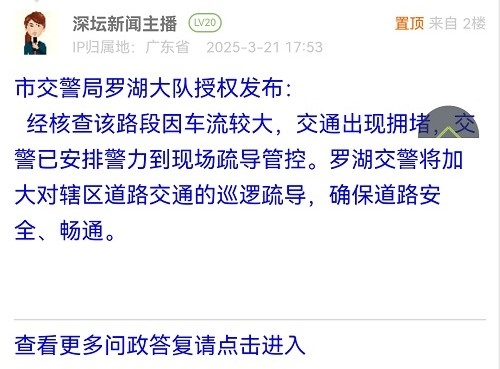 经核查该路段因车流较大,交通出现拥堵,交警已安排警力到现场疏导管控。罗湖交警将加大对辖区道路交通的巡逻疏导,确保道路安全、畅通。