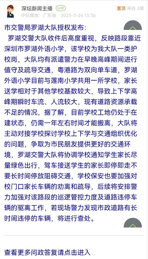 罗湖交警大队收件后高度重视,反映路段靠近深圳市罗湖外语小学,该学校为我大队一类护校岗,大队均有派遣警力在早晚高峰期间进行值守及疏导交通,粤港路为双向单车道,罗湖外语小学目前与莲南小学共用一所学校,家长送学相对于其他学校基数较大,导致上下学高峰期瞬时车流、人流较大,现有道路资源承载不足的情况,据了解,目前学校工地仍处于在建状态,仍需一年左右时间才能搬离,大队将主动对接学校探讨学校上下学与交通组织优化的问题,争取为市民朋友提供更好的交通环境,罗湖交警大队将协调学校通知学生家长尽量绿色出行,驾车接送学生的家长即停即走不要长时间停放阻碍交通,学校保安也要加强对校门口家长车辆的劝离和疏导,后续将安排警力加强对该路段的巡逻管控力度及道路违停车辆的驱离工作,若现场警力发现市政道路有长时间违停的车辆,将进行查处。