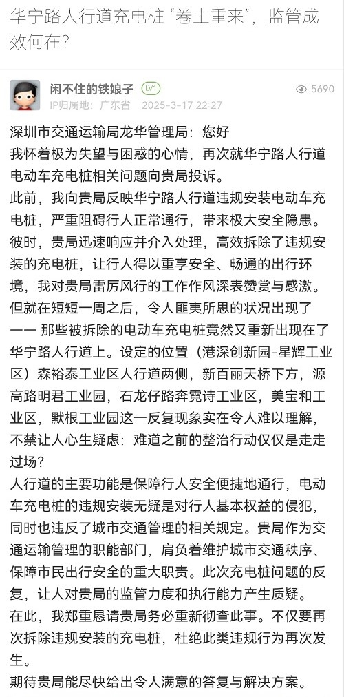 33. 帖文《华宁路人行道充电桩 “卷土重来”,监管成效何在?》