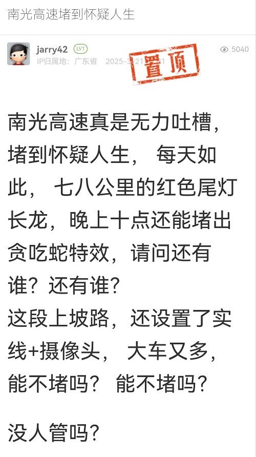 18. 帖文《南光高速堵到怀疑人生》