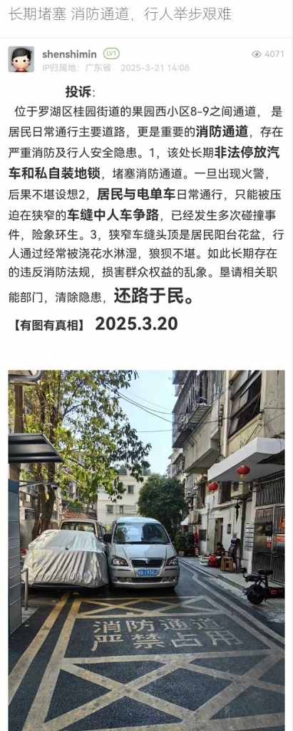35. 帖文《长期堵塞 消防通道,行人举步艰难》