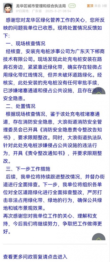 16. 帖文《紧急呼叫龙华城管局:绿化带被充电桩 “瓜分”,快救救城市绿洲》